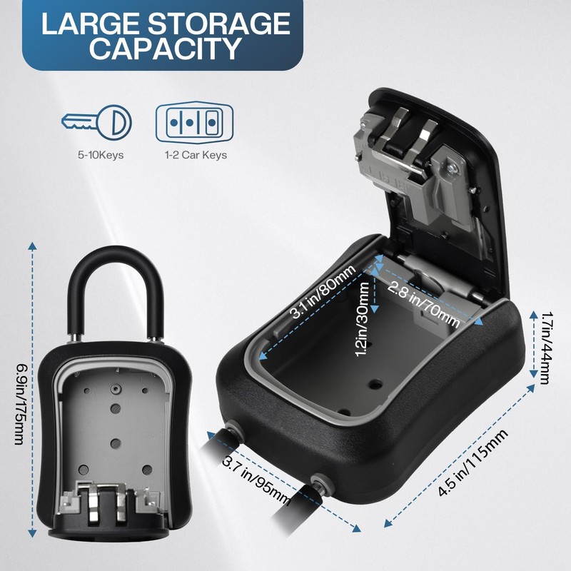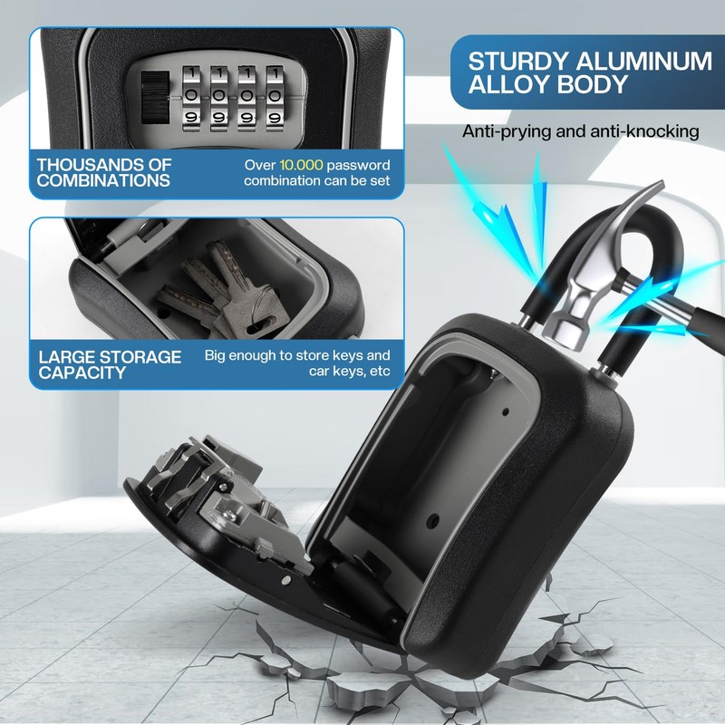 - Durable and sturdy: The key lock box is made of an aluminum alloy casing, zinc alloy, and heavy-duty steel lock head, making it more durable and sturdy. It can protect the box from hammering, sawing, or prying. You no longer need to hide your keys under carpets, vases, or stones.