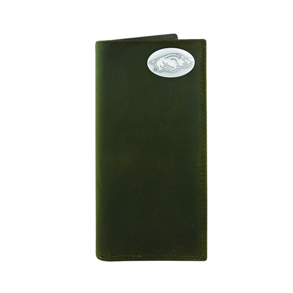 Carry your Arkansas Razorbacks school and team spirit with you at all times. This light brown genuine crazyhorse soft leather secretary-style roper wallet is decorated with a silver gun metal concho and features bill and checkbook compartments, an ID window, six card slots, photo sleeve insert and spare key holder. Attractive bagging to make the perfect gift for the ultimate Razorback fan.