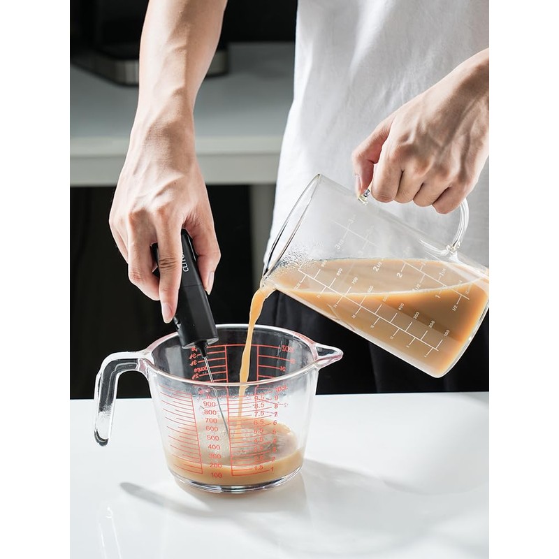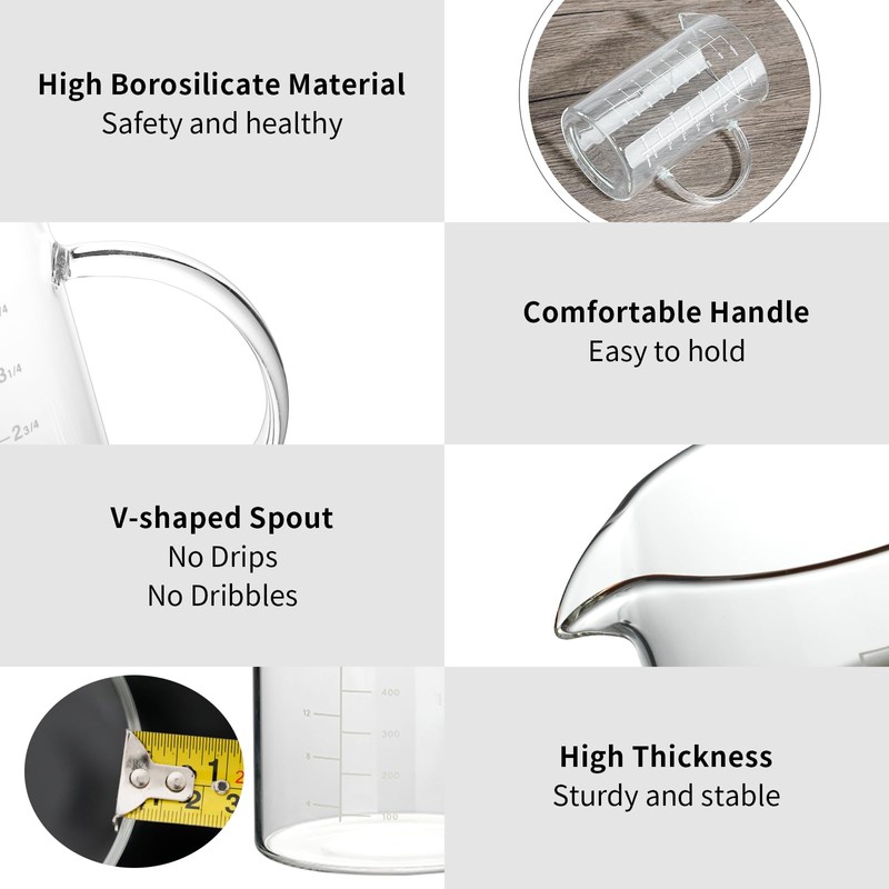 - No spill spout:shot glass measuring cup using V shaped spout for smooth pouring without dripping or spilling.And ergonomically insulated handle provide a comfortable,secure grip,making baking more convenient.