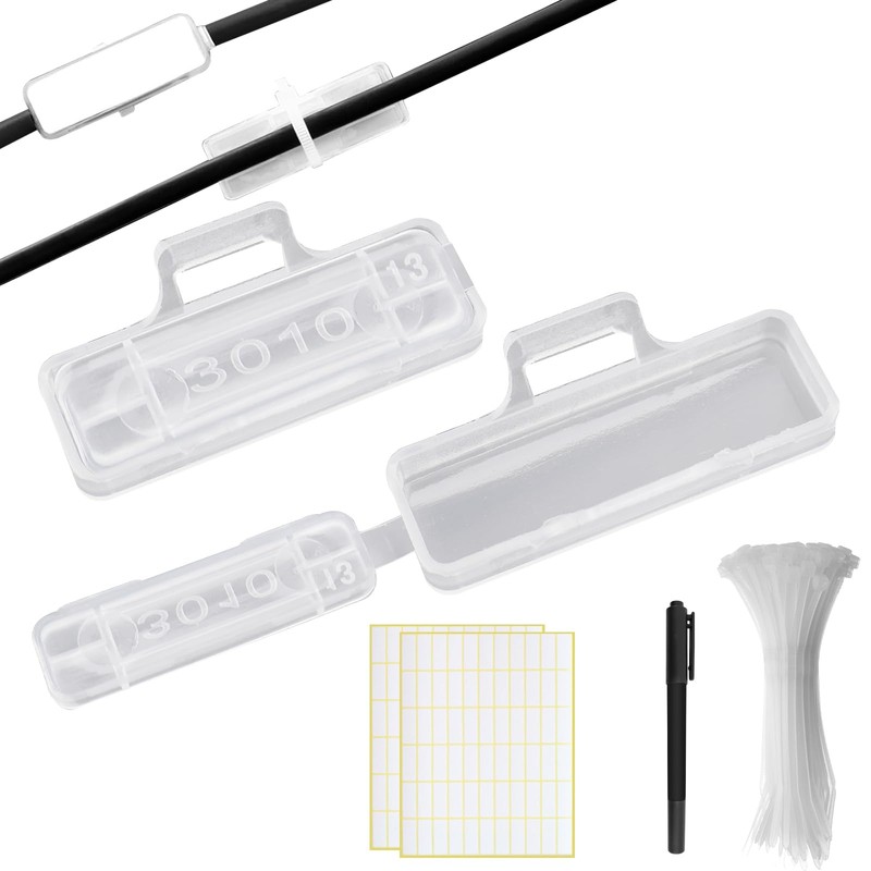 NCTNCX Cable Label Clip Pack of 100 Cable Marking Waterproof Cable Labels Identification Box Set with Cable Ties and Sticky Note, Black Marker for Labelling and Sorting (30 x 10 mm)
