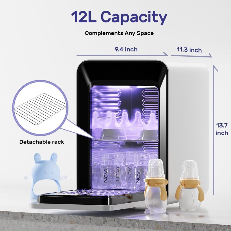 - 【Large 12L UV Sanitizer Box】9.4Lx11.3Wx13.7H inches, two-floor space design with a mobile stainless steel shelf that can hold up to 12 baby bottles, and there are four disinfection times of 5, 10, 20 and 35 minutes for different items to be chosen.