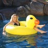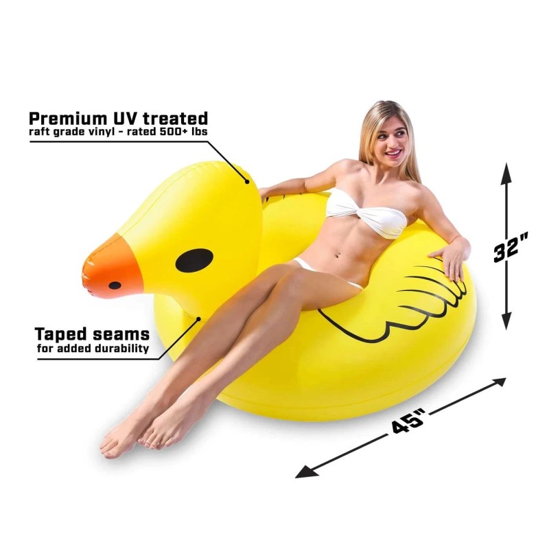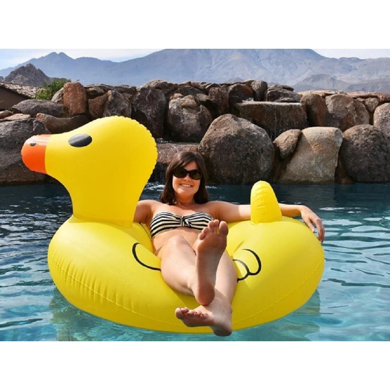 Large Yellow Duckie Pool Float Adult Pool Tube Float 500-lb Limit 45"Lx30"W. This inflatable ducky raft is a great addition to a pool party or a day at the lake. With a weight limit of 500 pounds and a cute duck design, this inflatable tube will provide hours of fun and comfort for just about anyone.