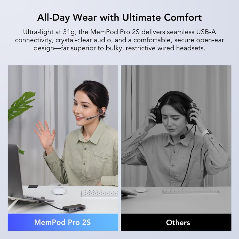 • Dual Connectivity: The MemPod Pro 2S open ear headphone can simultaneously connect to two devices. The multipoint connectivity allows for a seamless switching between two devices, like a phone and laptop, without the need to disconnect and reconnect. This boosts productivity by enabling multitasking, such as taking calls on one device while staying connected to another for media, and enhances convenience by eliminating the need for manual pairing.