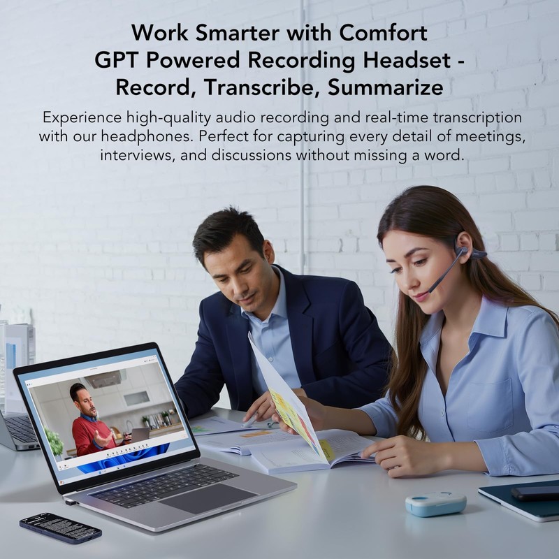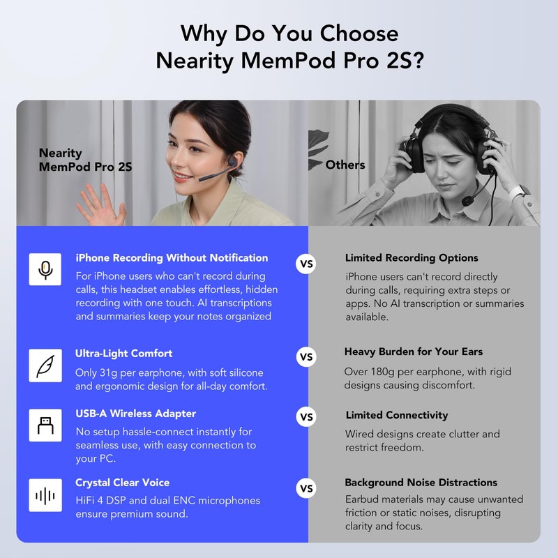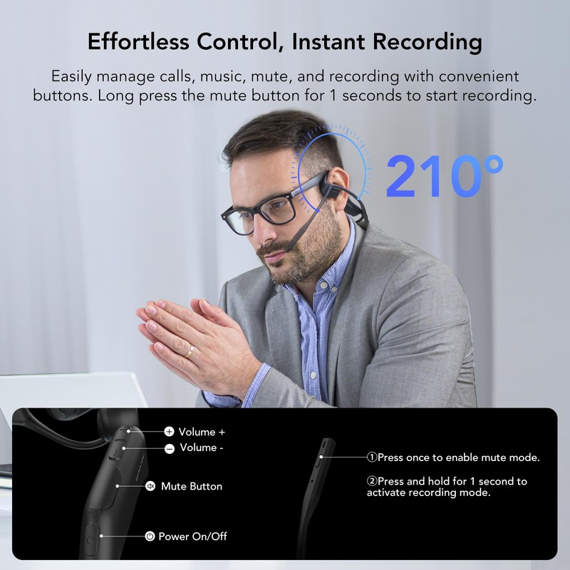 Nearity MemPod Pro 2S Recording Headset, Open Ear Bluetooth Headphones with Mic, ChatGPT Powered Transcribe & Summarize, Dongle, App Control, Support 97 Languages, for Lectures, Meetings, Calls Dual-Mode Recording: The MemPod Pro 2S works as a headset for calls, a music device, and a versatile recording device. It offers two modes: Phone Call and Normal recording. Start recording by easily controlling the Nearify application or long-press the mute button for 1 second. Designed for iPhone and Android users, it allows you to enable the recording function discreetly without notifying the other party. Perfect for clear audio during meetings, interviews, lectures, and note-taking. Nearify — Your Smart Audio Recording Assistant: Nearify leverages the power of ChatGPT to bring you a next-level recording experience. Record, transcribe, and summarize effortlessly. Whether you're on the go or offline, the app transcribes in English and Chinese, offering AI transcription and summarization for up to 480 minutes/month for free. With support for 97 languages, you can easily search, share, and manage your audio content. Recording and sharing are always free. Compatible with iPhone and Android. Reliable Connection with Dongle: In addition to Bluetooth 5.3, our open-ear Bluetooth headphones now feature a Dongle for stable, low-latency audio on PC and Mac. The USB connection eliminates wireless interference, ensuring seamless meetings, gaming, and recording. It’s plug-and-play for quick setup and provides continuous power for extended use. With broad compatibility and reliable performance, it’s the perfect choice for dependable connectivity. Crystal-Clear Calls with Advanced HiFi4 DSP: Experience superior noise cancellation with HiFi4 DSP and dual MEMS microphones. Whether you're in a noisy office, bustling street, or crowded restaurant, our open ear headphones ensure crystal-clear voice pickup. ENC technology effectively filters background noise, so the person on the other end of the call hears you with exceptional clarity, as if you were speaking face-to-face. Ultimate Comfort & Long Battery Life: With an open-ear design, our headphones provide comfort and safety while keeping you aware of your surroundings. Weighing just 31g and crafted from skin-friendly silicone, they offer a lightweight fit ideal for extended wear. Enjoy up to 15 hours of music playback or 12 hours of talk time on a single charge, combining all-day comfort with long-lasting battery life, so you stay connected without compromise. Dual Connectivity: The MemPod Pro 2S open ear headphone can simultaneously connect to two devices. The multipoint connectivity allows for a seamless switching between two devices, like a phone and laptop, without the need to disconnect and reconnect. This boosts productivity by enabling multitasking, such as taking calls on one device while staying connected to another for media, and enhances convenience by eliminating the need for manual pairing.