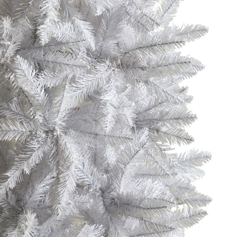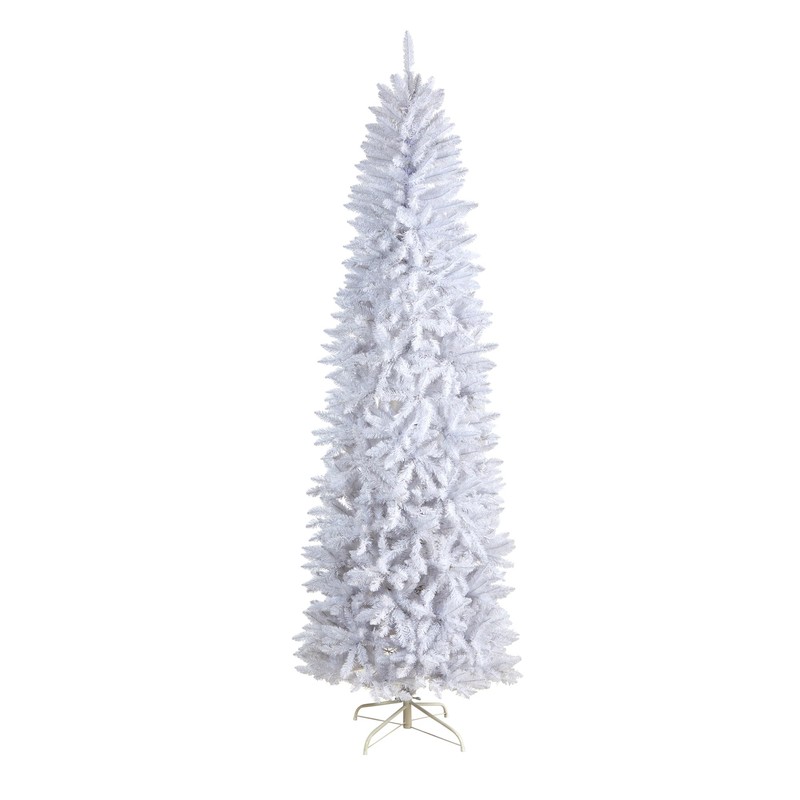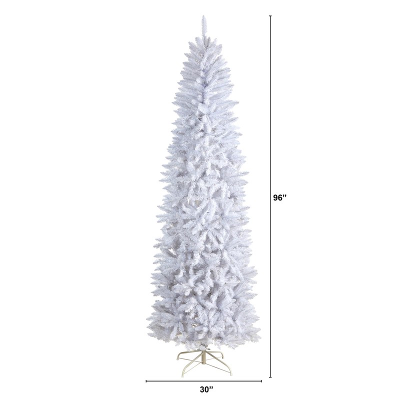 - SEASONAL DECOR ACCENT: Are you dreaming of a white Christmas? Fulfill all your dreams with this white artificial Christmas tree. Inspired by nature, this tree has a slim silhouette that mimics its real counterparts' natural foliage and texture. With 1348 bendable branches, you can easily display all your favorite ornaments. Standing 8' from a metal stand, curate in any area. Perfect for a family room, living room, or home office.