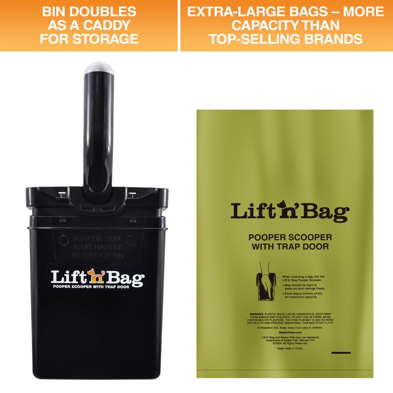 - INCLUDES SCENTED BAGS AND DISPENSER: Comes with 60 lavender-scented bags for odor control, plus a convenient leash-attachable dispenser. These bags are larger than standard pet waste bags and custom-fit for the Lift N’ Bag. For best results, use Lift N’ Bag refills; however, other large pet waste bags may also work.