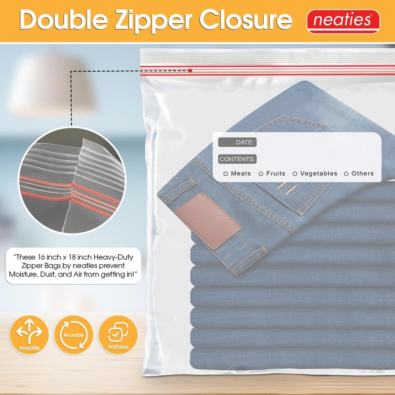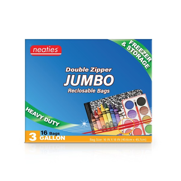 Neaties 3 Gallon Plastic Storage Bags with Double Zipper Top, 16 x 18 inches, 2.5-mil Thick, Reusable Freezer Bags, Clear, Set of 16