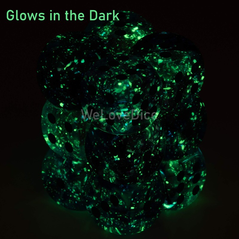 Chessex Nebula are transparent cubes whose colour swirls look like colourful drops of colour flow into clear water. The Nebula colours are also luminary. This means they glow at night and react to UV light.