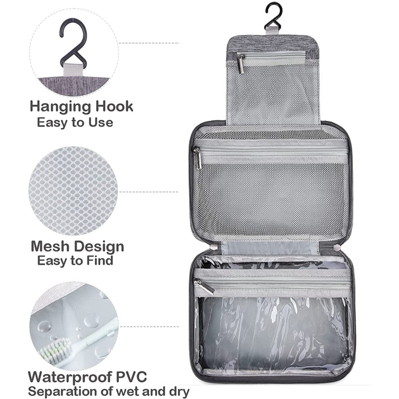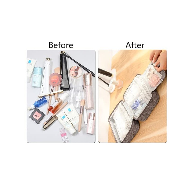 - 【 GRAN CAPACIDAD】: 9,8 x 6,5 pulgadas (plegado), 9,8 x 18,9 pulgadas (abierto). compartimento lo suficientemente grande con malla dividida y varios almacenes para mantener todas sus necesidades de viaje separadas y organizadas (maquillaje, champú pequeño, jabón, cepillo de dientes, pasta de dientes, kit de afeitado y más).