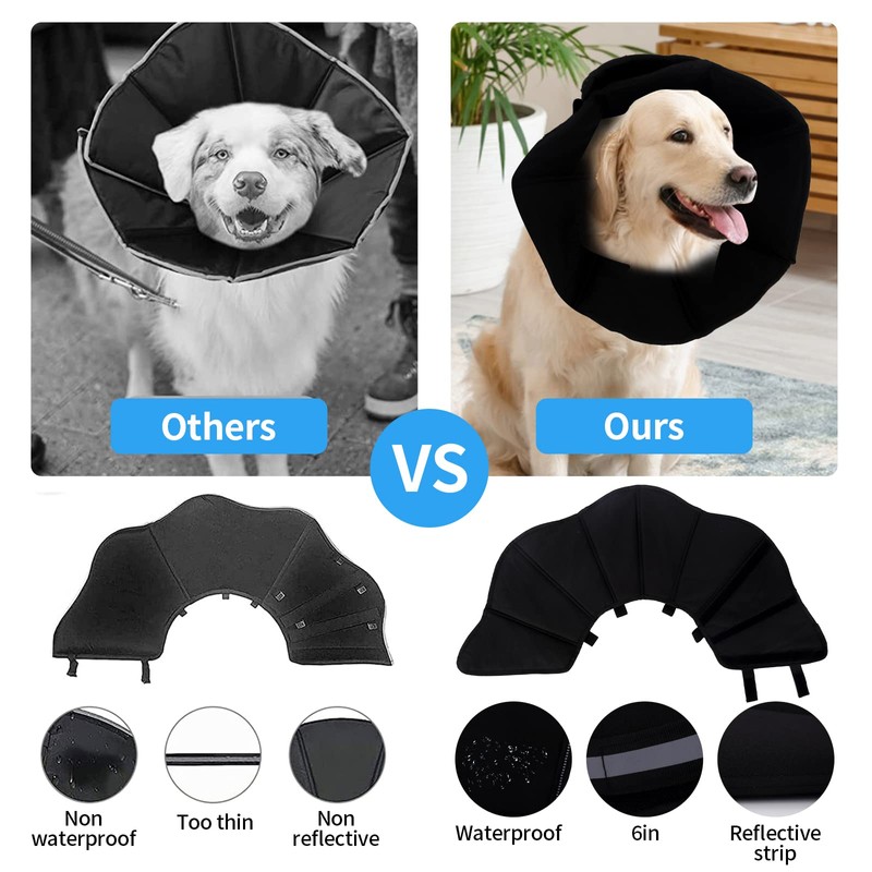 The dog recovery collar is made of waterproof Oxford and pearl cotton, which is soft and does not harm pets. Waterproof and easy to clean with warm water