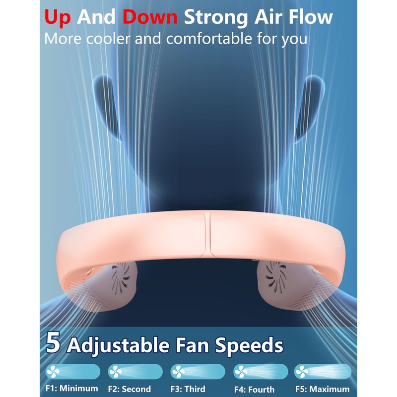 - đăUp&Down Wind Cooling Neck FanăFolding neck fan rechargeable features unique up and down air outlets, providing cooling air not only to the face but also to the body, effectively lowering body temperature.Fan with water spray misting fan has 5 adjustable wind speeds, with separate control buttons for wind speed and mist, allowing you to freely adjust modes according to personal preferences.(Note: Please wear it correctly according to the left and right markings on the misting neck fan)