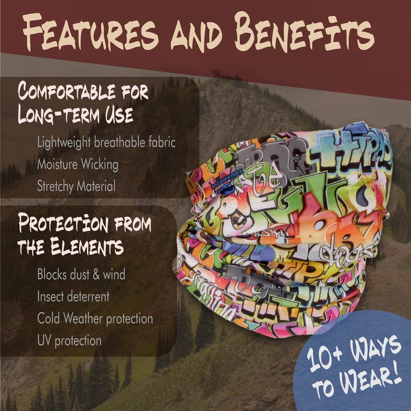- MULTI-FUNCTIONAL DESIGN: Many ways to wear it; including; face mask, face cover, neck gaiter, headband, wristband, scarf face mask, balaclava, face covering, seamless mask, fishing mask, dust mask, bandana, mouth cover, rally towel, blindfold, neck warmer, beanie, skull cap, winter mask, sweatband, tube scarf, hair tie, and much more.