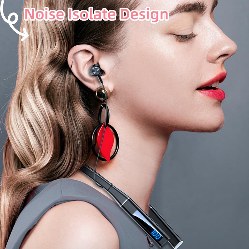 - Flexible Neckband & Magnetic Earbuds: The Bluetooth headphones feature a foldable, durable silicone neckband, allowing you to easily fold and store the device in your pocket. The magnetic earbuds are equipped with an automatic suction mechanism that securely attaches them together, preventing tangling during storage.