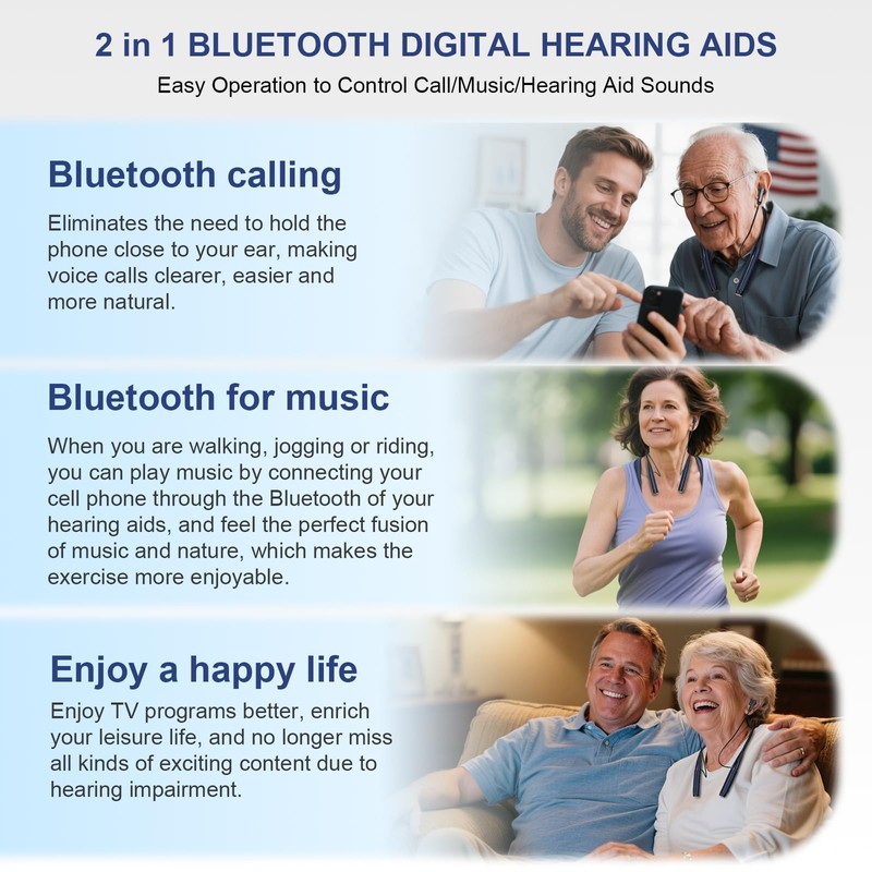 • Excellent Hearing Experience: 2 in 1 Bluetooth and rechargeable digital hearing aids reach high quality sound with background noise cancellation function by 16-channel technology. Transform your hearing aids into versatile Bluetooth headphones.Effortlessly switch between listening to your favorite music and taking phone calls,all while experiencing superior hearing enhancement—perfect for your dynamic lifestyle