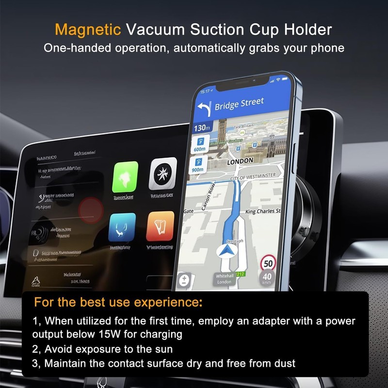 - 【Universal Compatibility】Our vacuum magnetic suction phone mount is specially designed for the phone with its magnetic attraction feature. Additionally, we provide a metal ring for non-magnetic phones and cases. Simply affix the magsafe ring to the back of your phone or case, and allow it to set for 24 hours to maximize adhesion.
