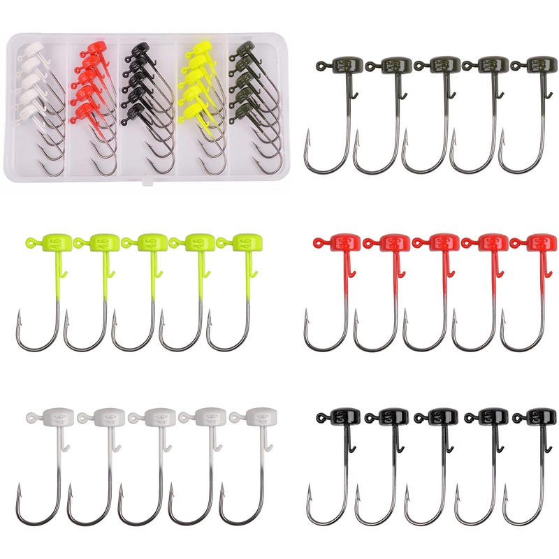 - 🐟【PACKAGE INCLUDED】25pcs mushroom jig heads in 5 assorted populor colors in a box. Black, Luminous White, Green Pumpkin, Chartreuse and Red.1/16oz, 1/8oz, 1/10oz Available 3 sizes allow you to match with different baits