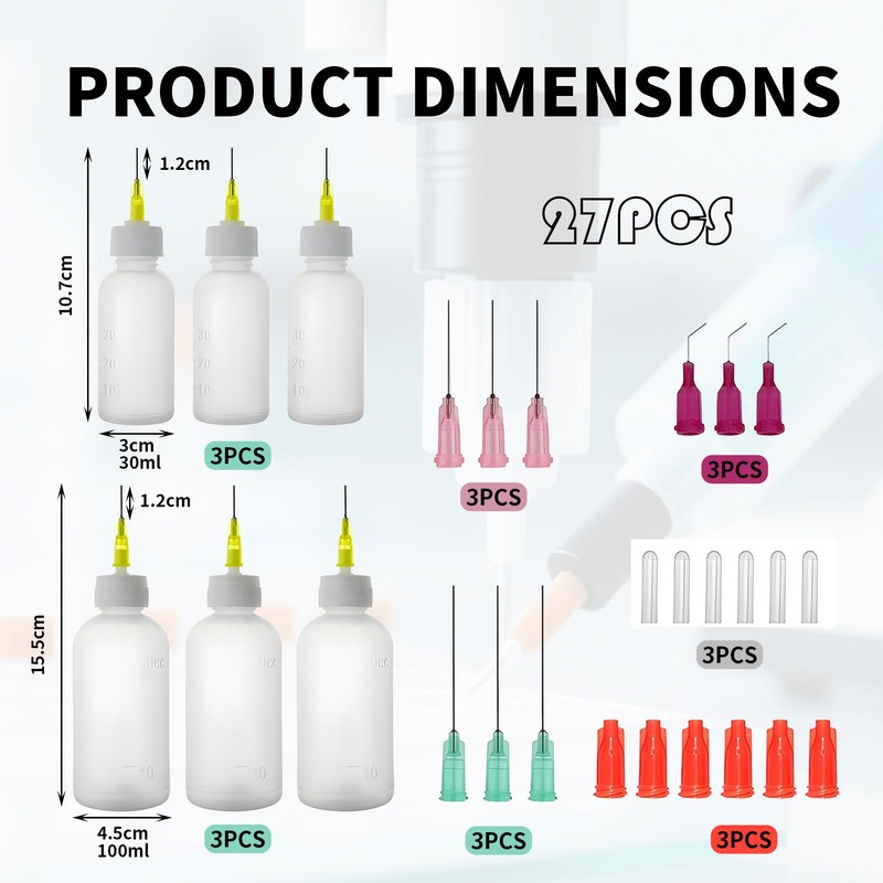 • Package includes: needle bottle (30 ml + 50 ml), blunt needle (18 G 1.5 inch + 20 G 1 inch + 20 G 0.5 inches), curved needle (25 G - 0.5 inches), 6 needle bottle caps, 6 needle caps.