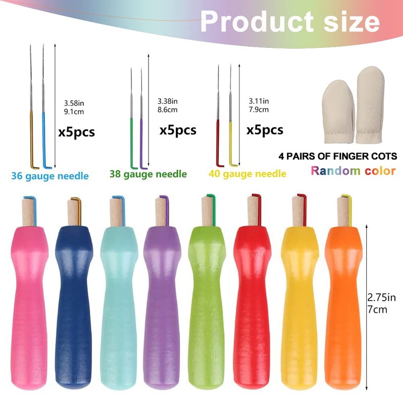 - Needle Felting Tools -- Consists of 30 pcs color coded felting needles, 8 pcs color wooden needle handles and 4 pairs of fingers cot for meeting all of your needs for wool felting.