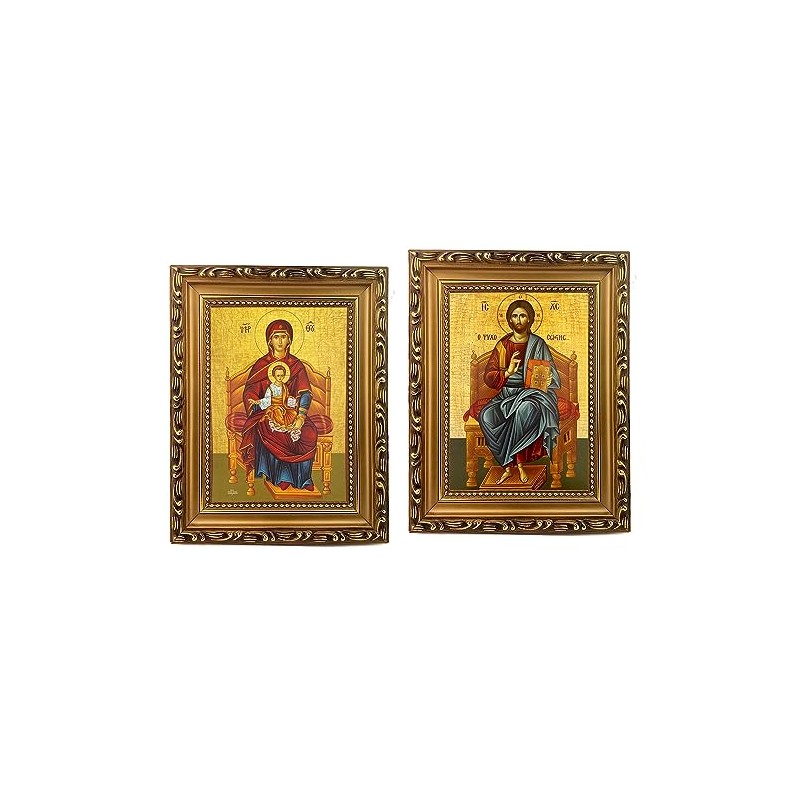 Needzo - Christ Blessing Icon and Virgin And Child, Platytera Enthroned Theotokos Greek Byzantine Icons, Pair - Set of 2, Gold Framed 9 3/4 Inch