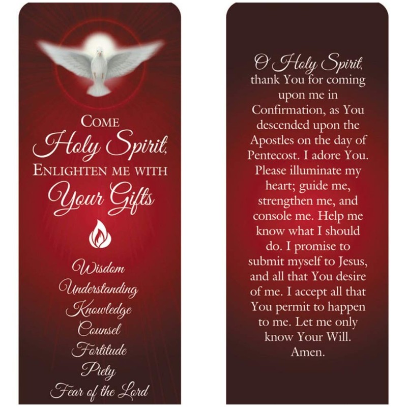 - The Front Of The Bookmark Reads " Come Holy Spirit, Enlighten me with Your Gifts. Wisdom, Understanding, Knowledge, Counsel, Fortitude, Piety, Fear of the Lord "