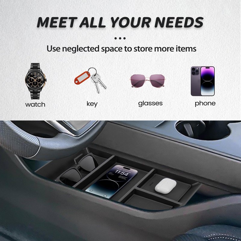 • Function: The center console tray feature a division design to store small items; Its design allows you to easily store and organize essentials like cards, keys, cash, and wallets, etc