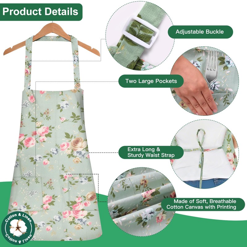 - Robust and stylish apron women: made of durable, soft and breathable canvas, the apron reliably protects against oil and dirt - green background with rose pattern gives kitchen and garden a natural atmosphere