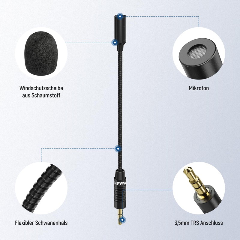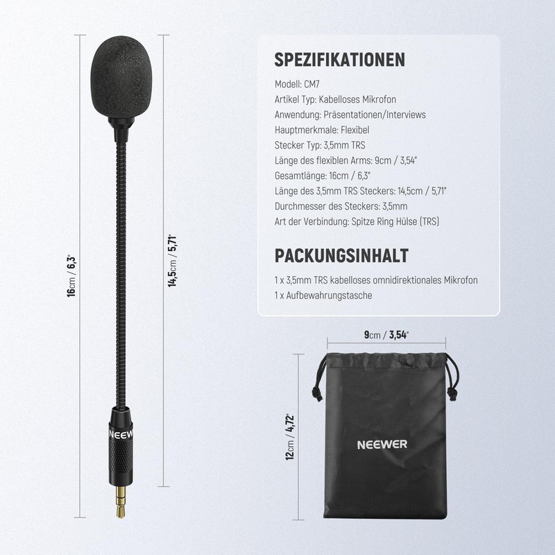 - Wireless microphones with flexible arm and foam cover: the total length is 16 cm (14.5 cm without the 3.5 mm TRS head). The flexible design of the condenser microphone allows the wireless microphone to bend and position arbitrarily, so that clear sound can be recorded in any situation. This design features flexible arm, bendable boom and metal microphone as well as windproof foam cover that protects microphone from dust, moisture and corrosion damage