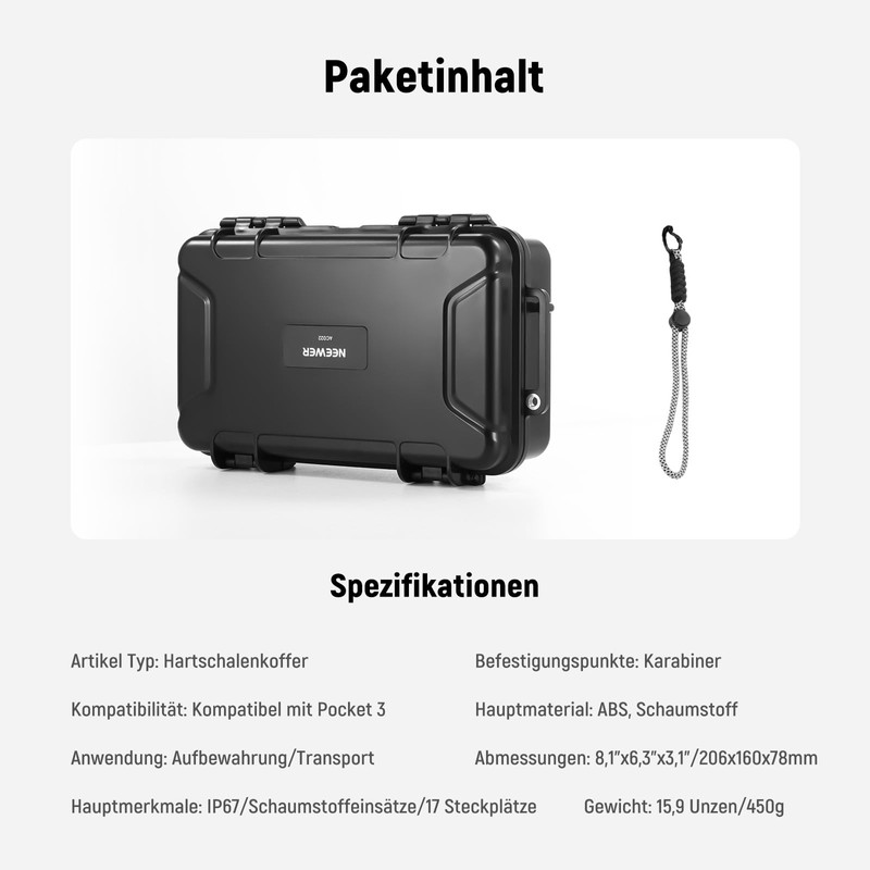 • Box contents: 1 x hard case for Pocket 3; 1 x wrist strap; 1 x carabiner; 1 x user manual (English language not guaranteed). Note: all accessories from the Pocket 3 Creator Combo are sold separately