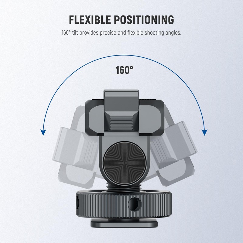 軽量アルミ製アダプターは、コンパチブル Action 5 Pro、Action 4、Action 3で、クイックリリーススロットと内蔵マグネットでしっかりと固定できます。160°チルト機能により正確なポジショニングが可能で、カメラケージ用コールドシューと三脚用1/4"ネジ穴を備え、携帯性と耐久性を兼ね備え、耐荷重は3kgです。