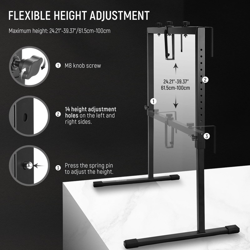 - 【Spring Loaded Height Adjustable Columns】 Each side column features 14 positioning points for height adjustment. Via spring loaded pins and M8 screws, you can easily adjust the height in a range of 24" - 39" (61.5 - 100cm) based on different shooting requirements. Also, additional super clamps or other accessories can be purchased for flexible and effective expansion on the side columns.