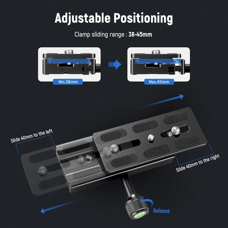 • 【Standard Quick Release Plate】Compatible with Arca Swiss standard quick release plates, such as PU-50/PU-60/PU-70/PU-100/PU-120/PU-150/PU-200; Clamp sliding range: 38-45mm, you can also secure your Arca-compatible telescope or lens ring on the clamp that features the standard dovetails.