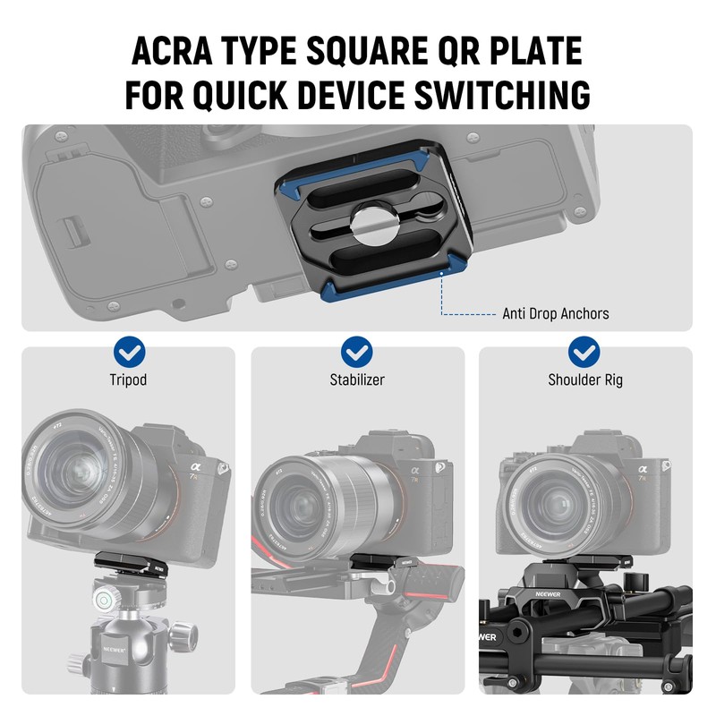 It has a NEEWER SR006 Arca Type Quick Release Baseplate that can mount your DSLR camera and camcorder via a 1/4" and a 3/8" screw or secure a camera cage with standard Arca type dovetails.