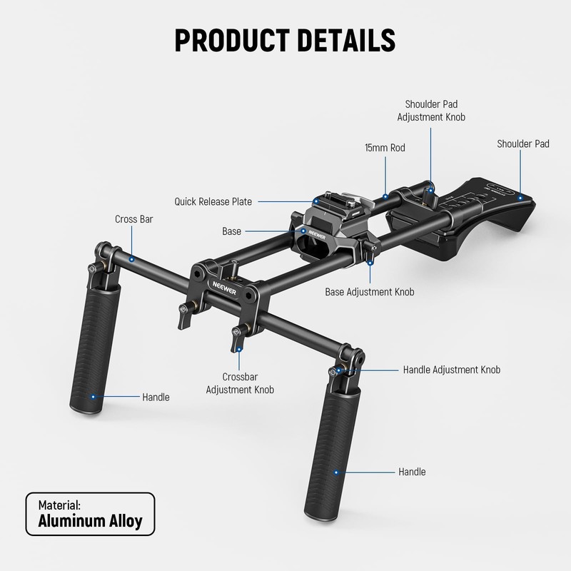 - 【15mm Rod Camera Shoulder Rig】 NEEWER SR007 is a 15mm rod system based modular shoulder rig with a standard 60mm rail gauge, enabling NEEWER accessory integration for pro video recording content creation: PG002 matte box, PG001/PG003 follow focus, PS006 V mount battery plate, CA012 lens support, etc. Compatible with SmallRig Matte Box Follow Focus, compatible with NICEYRIG 15mm rod rail system, compatible with Tilta 15 LWS extension rod camera support stabilizer system