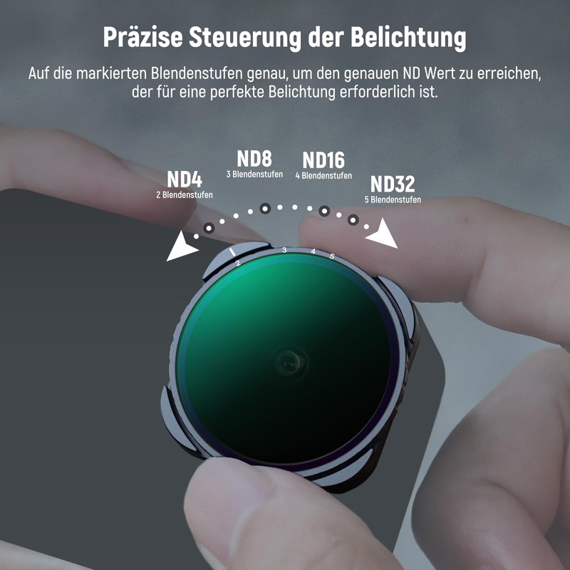 - Adjustable exposure control: Hard stops at both ends limit the neutral density between ND4 and ND32 (2 and 5 stops). Simply turn to the exact mark to achieve precise neutral density values and capture moving subjects with expressive motion blur effects