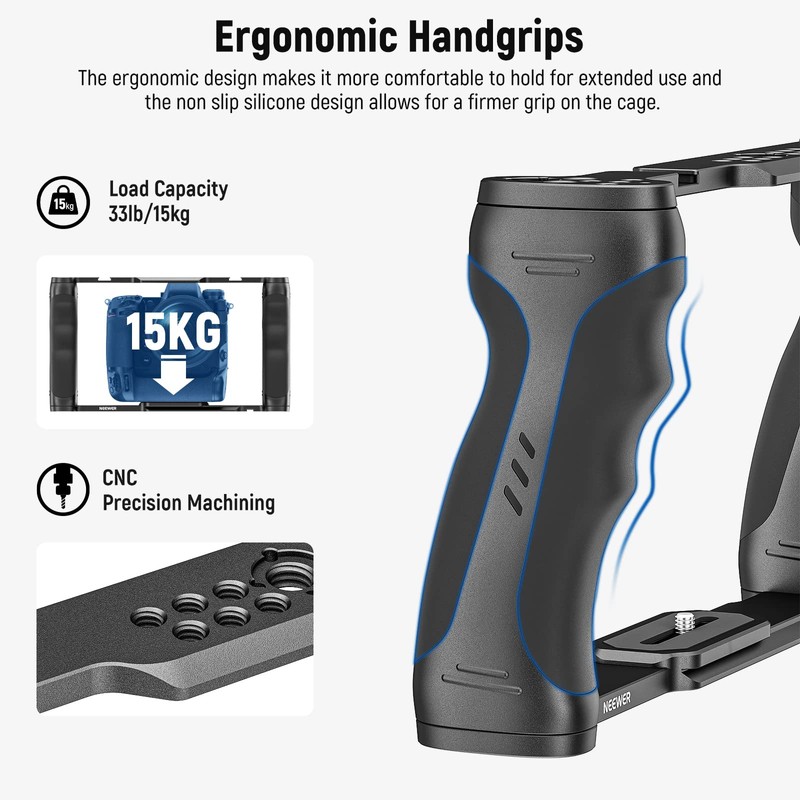 NEEWER Video Camera Cage Rig with Arca Type Base, Dual Grips, 3/8" ARRI Locating & 1/4" Threads, Cold Shoes, Universal Camera Stabilizer Compatible with SmallRig NEEWER Baseplate 15mm Rods, CA016