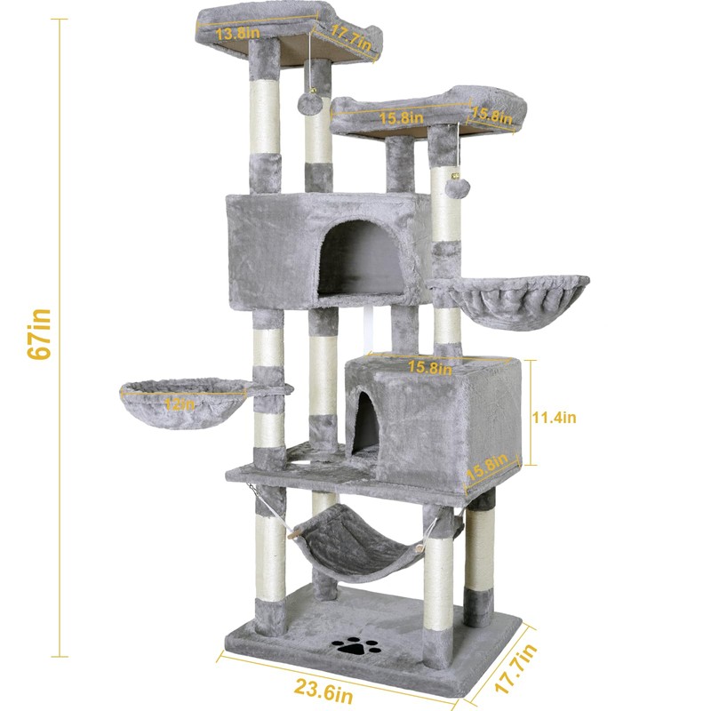 - EASY TO ASSEMBLE : with Allen key offered,this cat tower for indoor cats can be easily assembled by one person within 30mins. Overall dimension - 23.6"L x 17.7"D x 67"H (60 x 45 x 170cm), perfect for 3~4 large kitties/adult cats .
