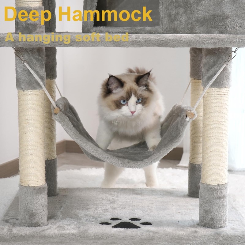 - ROOMY & ENJOYABLE:No matter overlook the world on the top perch, melt into the luxury hammock, or feel spoiled in the cozy cradle, this cat tree tower works perfectly as a recreation paradise! Interact with hanging ball , tour freely in the castle across the platforms, or just be lazy in the warm condo.