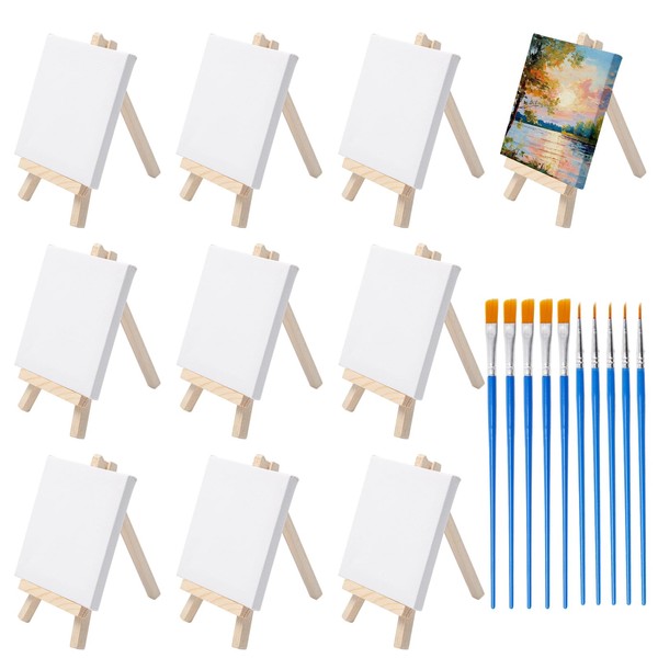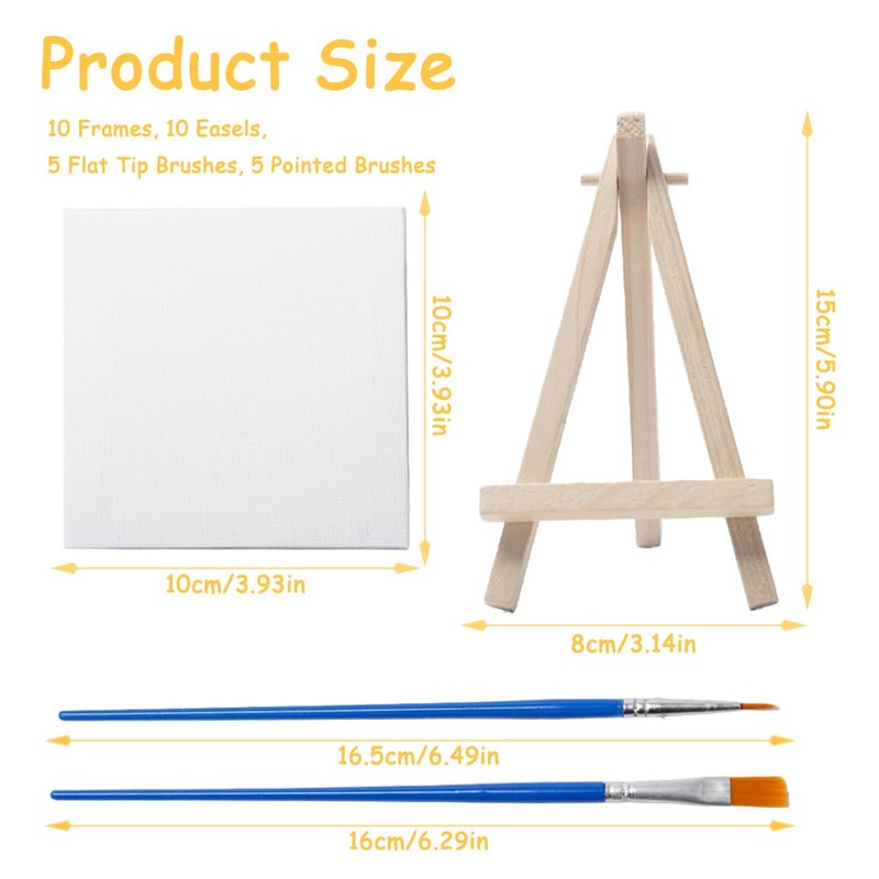 - 🖼 Packaging and Size:This mini canvas easel sets contains 10 blank canvases, 10 easels and 10 brushes. The canvas measures 10 x 10 cm (3.9 x 3.9 inches). The easels measure 15 x 8 cm (5.9 x 3.1 inches). Whether you are a novice or an experienced artist, this canvas is a must-have!