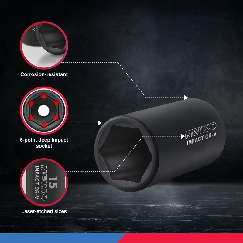 NEIKO 02474A 1/2" Impact Socket Set, 15 Piece Metric Socket Set 10-24 mm, Deep Sockets, 6 Point, 1/2” Drive Sockets for 1/2" Impact Wrench, Chrome Vanadium Cr-V