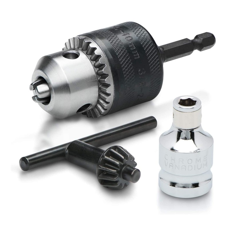 - EASY ON AND OFF: Socket drive chuck adapter has a 3-jaw chuck securely holds round-shank drill bits and includes 1/2 inch adapter to quickly go from driving to drilling with any chuckless drill.