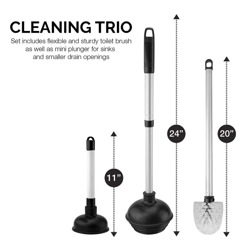 The Neiko 60168A Plunger Set is the perfect bathroom combination for any home owner. It comes with our newly redesigned plunger, toilet brush, storage caddy, and mini sink and drain plunger. Super-pliable industrial-rubber cup with tiered ridges forms an ultra-tight seal on any size drain. Heavy-duty aluminum handle allows for maximum pressure forced to alleviate the source of clogging. Designed to work effectively at any angle for hard-to-reach, low- clearance applications. Our new telescopic handle retracts down to only 17 inches, allowing for discreet storage.