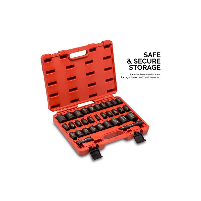 • [INCLUDES]: This complete set comes with the following pieces: 29 x 1/2" drive sockets - SAE: 3/8, 7/16, 1/2, 9/16, 5/8, 11/16, 3/4, 13/16, 7/8, 15/16, 1, 1-1/16, 1-1/8, 1-1/4", Metric: 10, 11, 12, 13, 14, 15, 17, 18, 19, 21, 22, 24, 27, 30, 32mm; 2 x 1/2" extension bars: 3, 5-inch, 1 x 3/8" (F) to 1/2" (M) adapter.