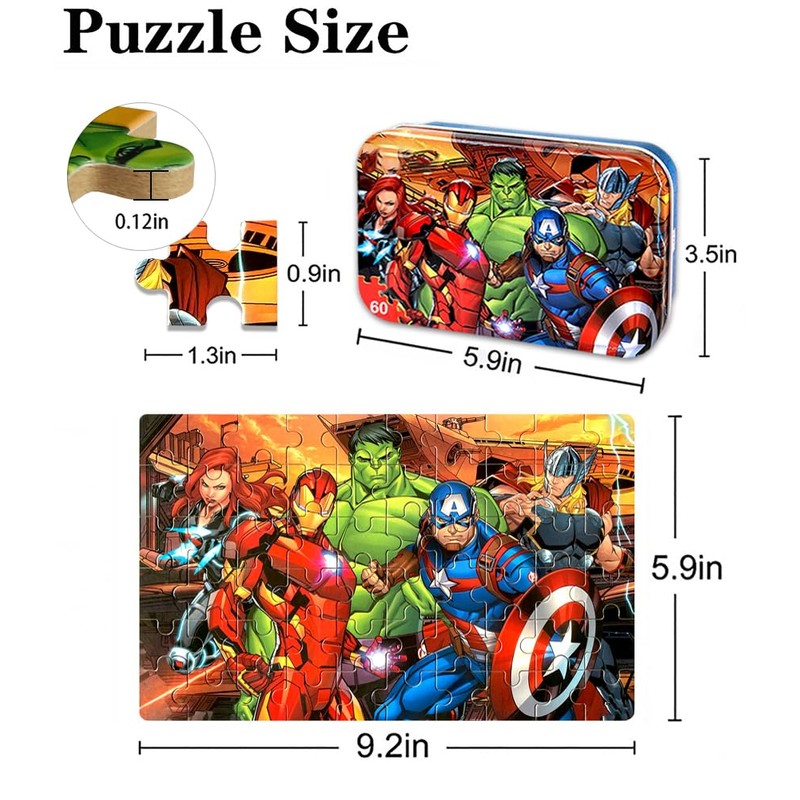 - STURDY TIN BOX STORAGE: Our 60 Piece Puzzles are Packaged in a Sturdy Tin Box Which is 5.9” x 3.5”. The Tin Box is a Nice Storage container and also an Ideal Place to Keep Pieces Safe, and away from Damage. Also, It Makes a Great Gift for All Ages at Birthdays and Holidays.