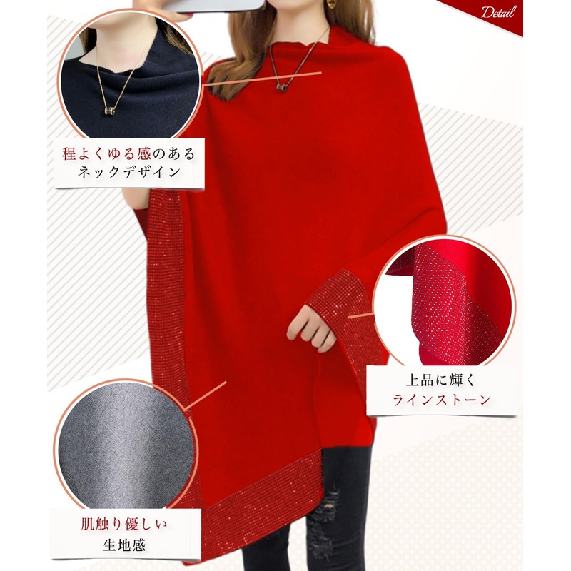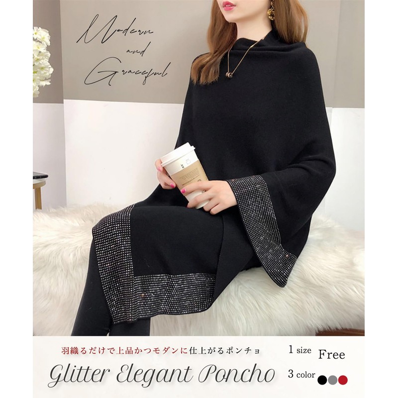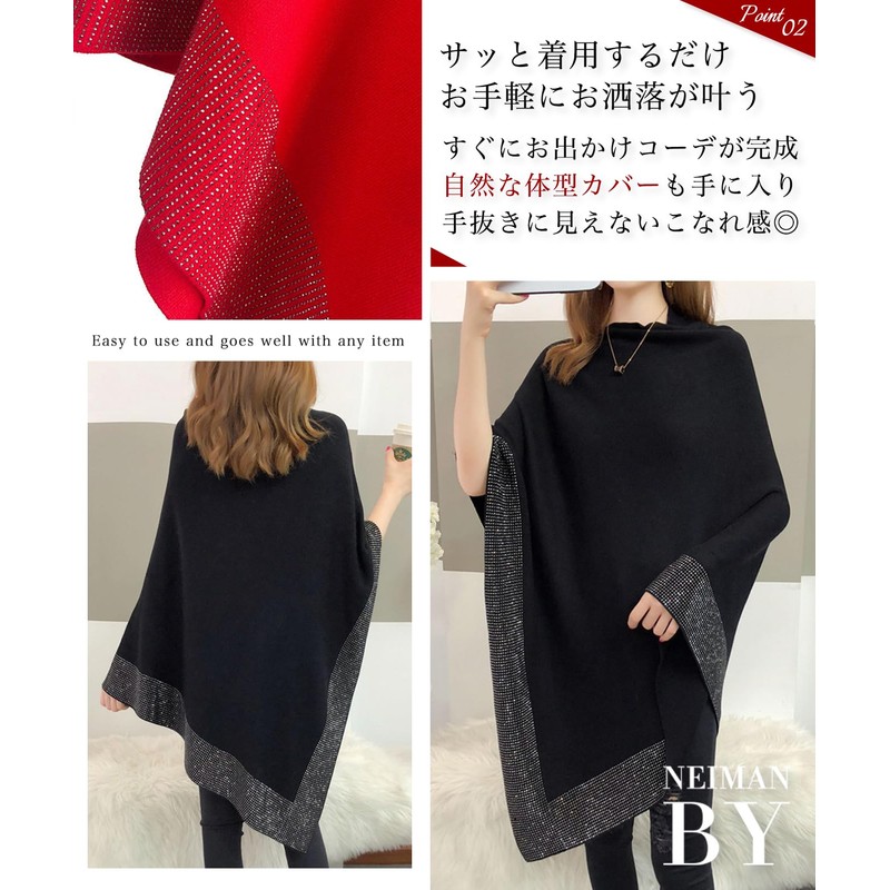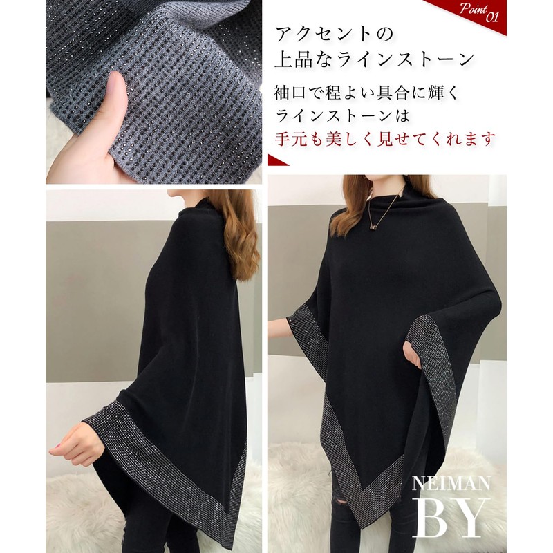 - A fashionable poncho with rhinestones on the hem adds an elegant impression. This piece has a good balance that is not too flashy or too simple. The rhinestones are not overly overstated, and they are accented to give off a sophisticated adult elegance. It can be easily worn and is also an excellent short-time item that is easy to wear. Because it has an invisible finish, it is very strong with just one piece. Recommended as one mile wear. A must-have item for autumn and winter