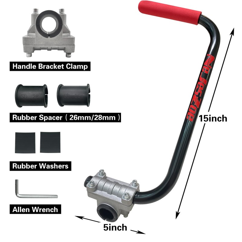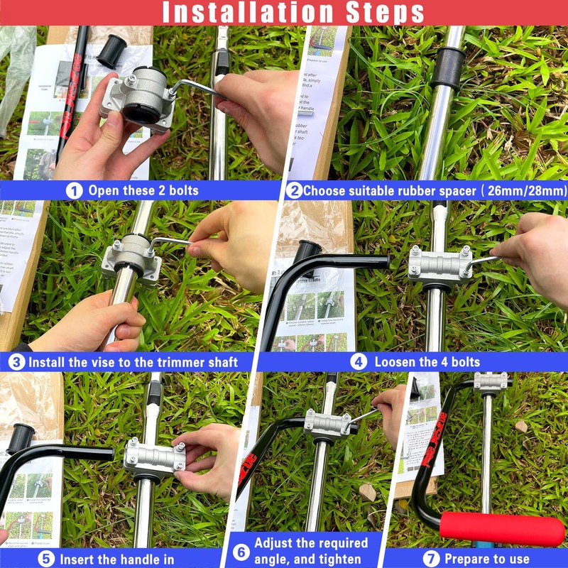 - Easy to Install: We provide installation instruction manual. This for weedeaters handle grip is easy to install on the trimmer shaft. Use the included allen wrench to remove the bolts and vise top, install the vise to the trimmer shaft, use the allen wrench to tighten the vise to where you need it. Note: You can flexibly use the rubber spacer(26mm/28mm) and rubber washers to tighten the bracket clamp on the trimmer shaft.