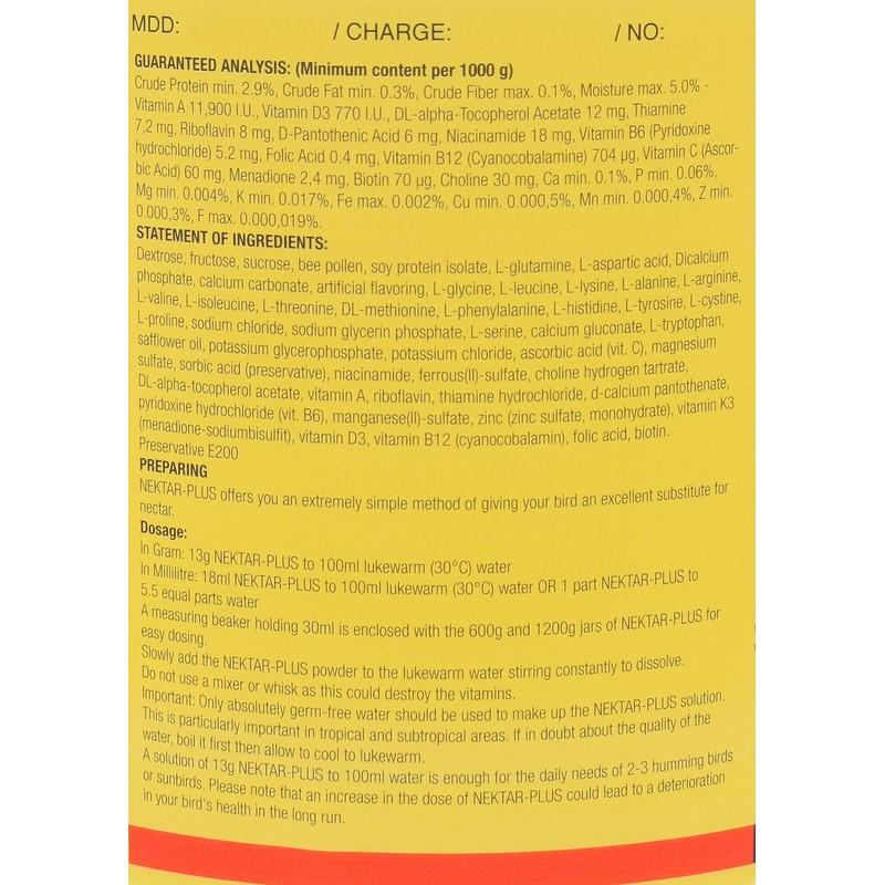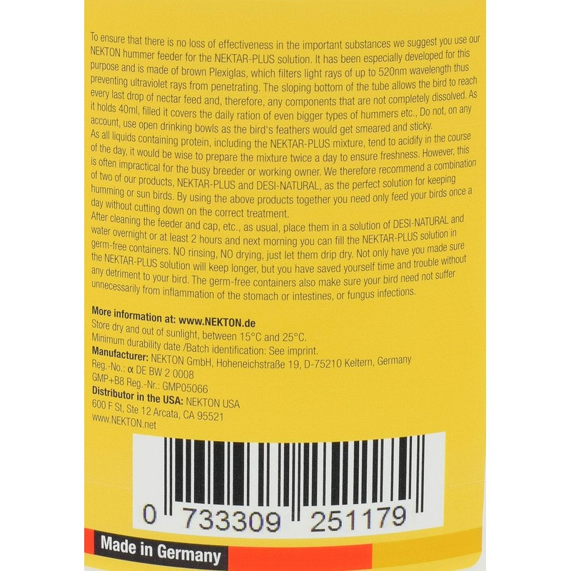 Complete feed for hummingbirds, sunbirds and Butterflies The composition of nekton-nectar-plus is oriented towards individual components of the hummingbirds' High requirements for nutrients and substances, where at the same time, nekton-nectar-plus has also become an excellent food mixture for sensitive sunbirds. The carbohydrates' Composition reproduces flower nectar - which is the preferred source of nourishment for hummingbirds and sunbirds - and thus supplies These animals' Metabolism with energy. Supplemented by vitamins, proteins, fats, major and trace elements, a balanced mixture emerges which contains all essential elements for these birds. We recommend the Nekton feeding tube for feeding, which has been specially developed for nekton- nectar-plus. This ensures an extended shelf life of the important food components. The filling quantity of 40 ml is sufficient even to provide larger species with a single Feeding per day. Under no circumstances should open Feeding bowls be used, as this makes contaminations of these animals' Feathers unavoidable.