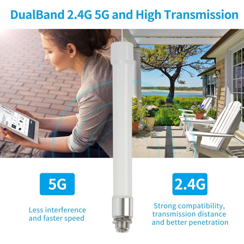 - Frequency Range:2.4GHz (2400 - 2485 MHz),5GHz/5.8GHz (5150 - 5850 MHz). Gain:8dBi; Antenna Connector: N-Female; Impedance:50 ohm; SWR≤1.5; Antenna Length:20cm; Orientation: Omnidirectional