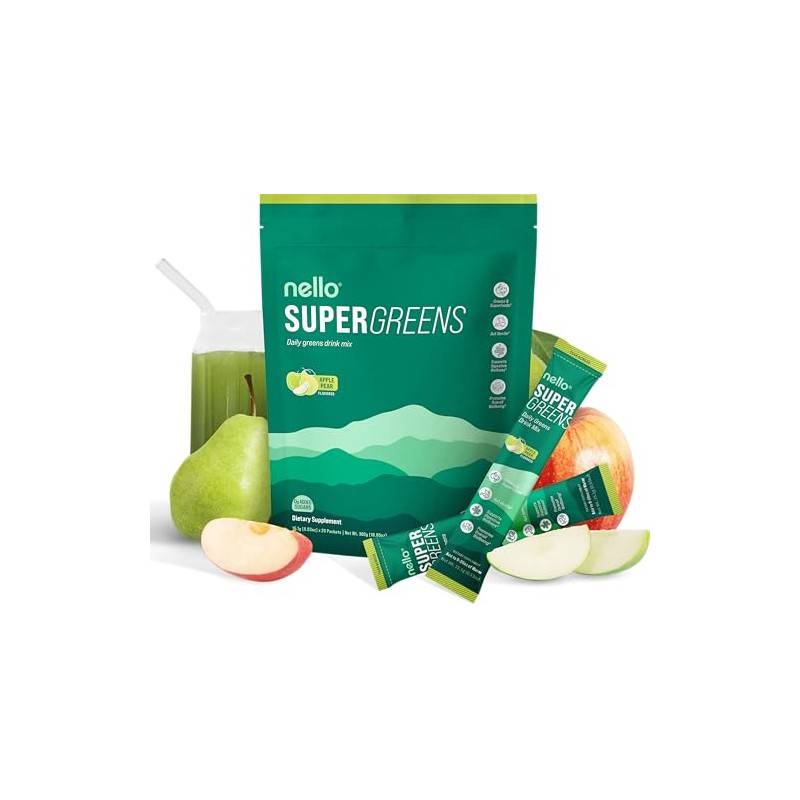 Nello Supergreens Superfood Drink Mix with Chlorella, Moringa, Spinach, Broccoli, Digestive Enzymes, and Probiotics – Apple Pear Flavor, 20 Servings, Travel Pack