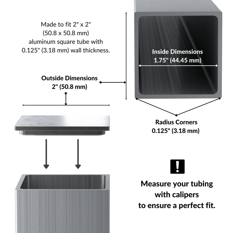 • Precise Fit: These press fit aluminum fence post end caps are made to fit 2” x 2” square tubing with a wall thickness of 1/8”. Outside radius edge 1/8”. 4 Pack of metal post caps.