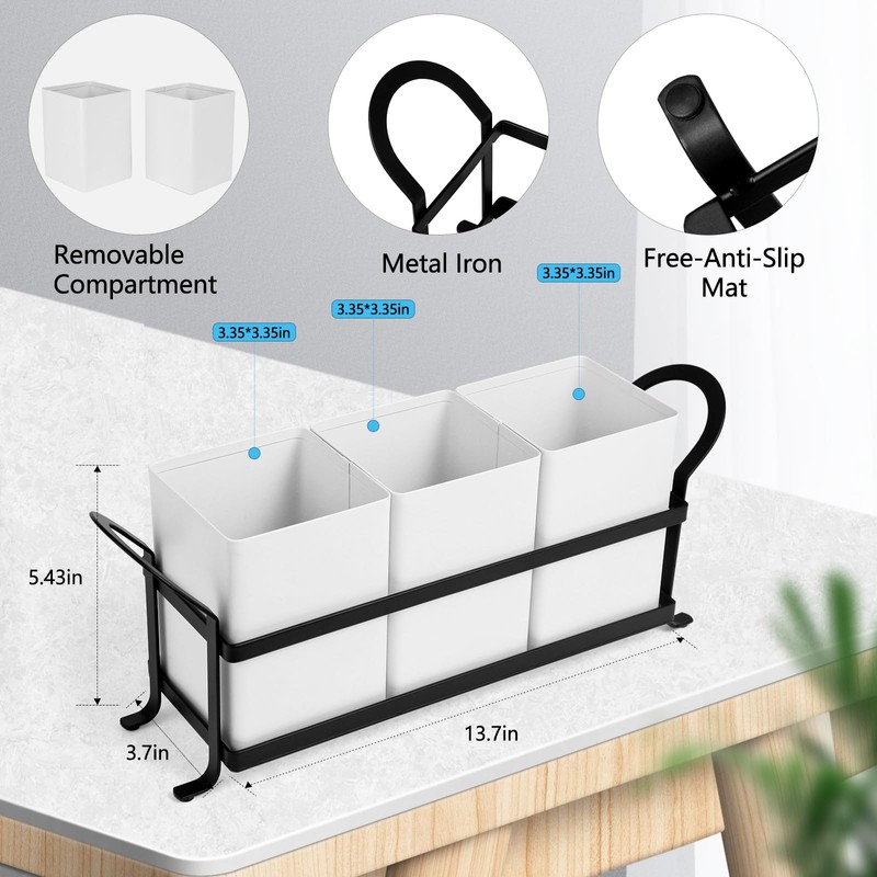 - FUNCTIONAL UTENSIL CADDY: The three compartments are set in a metal rack with a compact measurement of 13.2" L x 3.8" W x 5.8" H and each of the containers is removable separately, the rectangle holder can equip with a good amount of utensils, It is good idea to refresh a cluttered kitchen counter and well-organized by this stylish silverware holder
